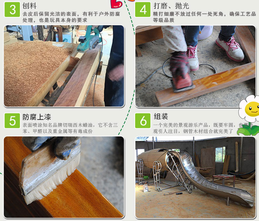 滑梯的部件均采用進口水曲柳木,木質堅硬,干燥性能良好,耐水性較強,不易磨損,不易開裂,不易變形,紋理通直。