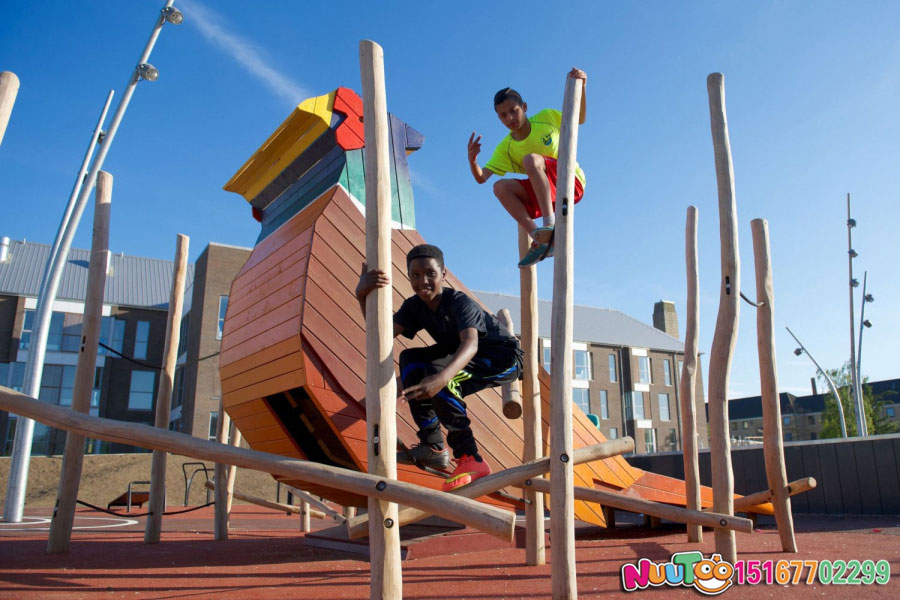 室外木質組合滑梯集鉆、爬、滑、刺、擺等功能于一體,可培養兒童的獨立個性、鍛煉能力、大腦和智力。該裝置具有任意性、無動力、交互性和安全性等特點。設計簡單,是幼兒園中必備的戶外大型玩具。