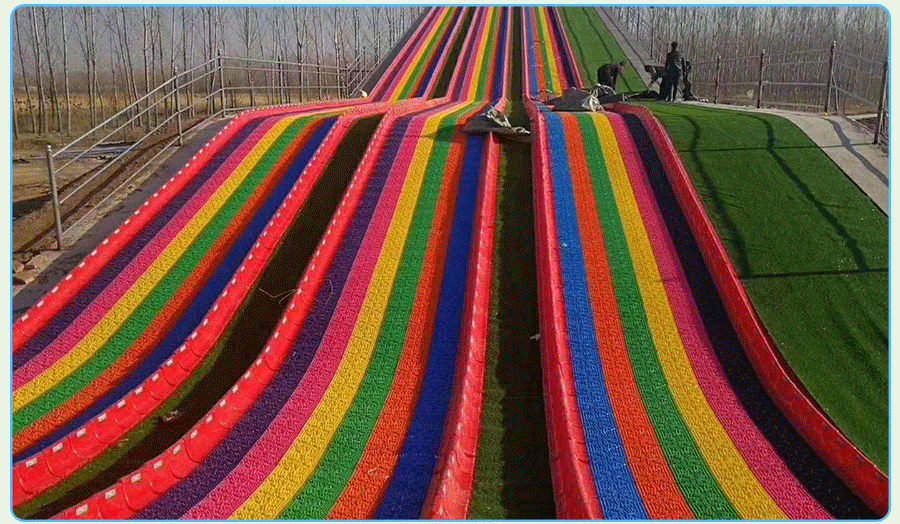 七彩滑道又名旱雪滑道,彩虹滑道。七彩滑道的游玩方式很簡單,人只需在雪圈上坐穩抓牢就可以了,然后從坡上滑到坡下,既刺激又省勁,非常有趣。同時,七彩滑道也可以根據客戶的要求制定顏色。豐富多彩的顏色不僅能讓人感到快樂,還能吸引更多的游客。七彩滑道具有施工方便、易于安裝的特點,可大大降低施工成本,不失為冬季滑雪以外的好項目。