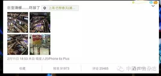 果不其然,對此事件的溯源證實了我的猜想,這個“巨型滑梯”的話題起源,是一個名為微博網友@筋肉兄貴喵星人在2016年2月11日發微博稱,被 “巨型滑梯”嚇尿了,微博上還配了照片。嚇尿的原因是因為巨型滑梯一路從頂層建造到底層,有5層樓那么高。這條微博截至2016年2月13日24時止,被網友轉發51973次,評論多達25465條,點贊25711次。而從最早的2016-02-12 17:54新聞晨報[微博]媒體報道至相同截至時止,百度搜索“上海商場驚現巨型滑梯”關鍵詞,竟有相關結果約3,430,000個網頁,找到相關新聞253篇,而這只是一天多的傳播速度。