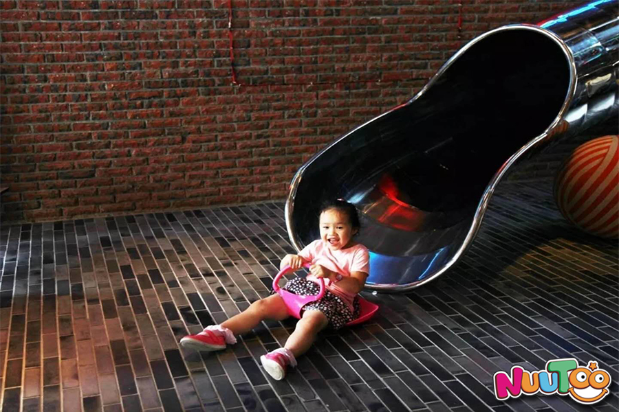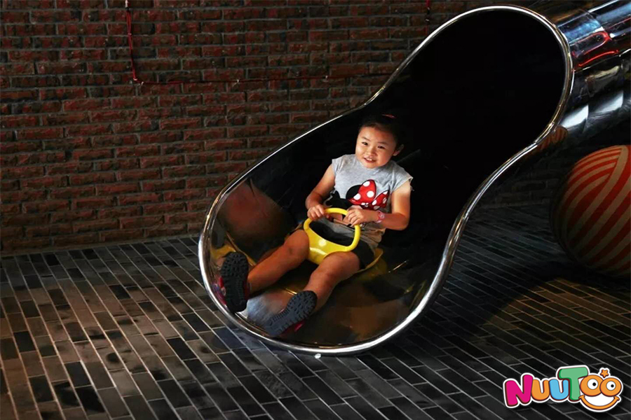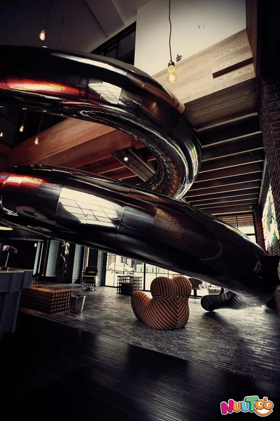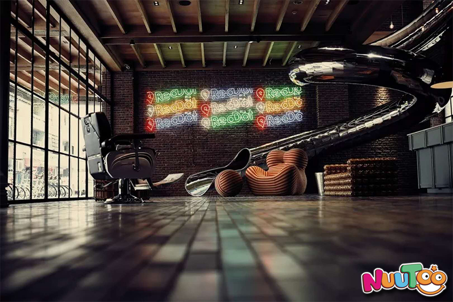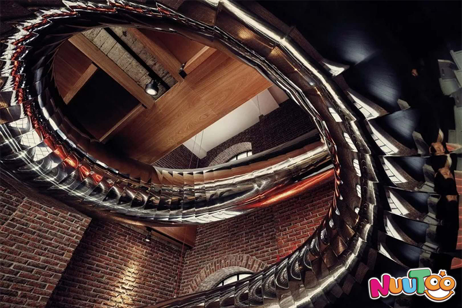 有趣的元素包括了一部從二層到一層的不銹鋼螺旋滑梯,這部不銹鋼滑梯能夠立即抓住每個(gè)人的眼球。該不銹鋼滑梯由102塊不銹鋼板組成,長(zhǎng)27米。每個(gè)顧客坐上不銹鋼滑梯滑下,里面都充滿了歡聲笑語(yǔ),都很享受這個(gè)體驗(yàn)。我們想象一下,反射著霓虹燈燈光的不銹鋼滑梯就如同一部時(shí)空隧道,帶回了我們的回憶。所以,該不銹鋼滑梯的設(shè)計(jì)師,史蒂芬.吳堅(jiān)信,該不銹鋼滑梯不是簡(jiǎn)單的為了取樂(lè),而是時(shí)空倒轉(zhuǎn)的一種象征。