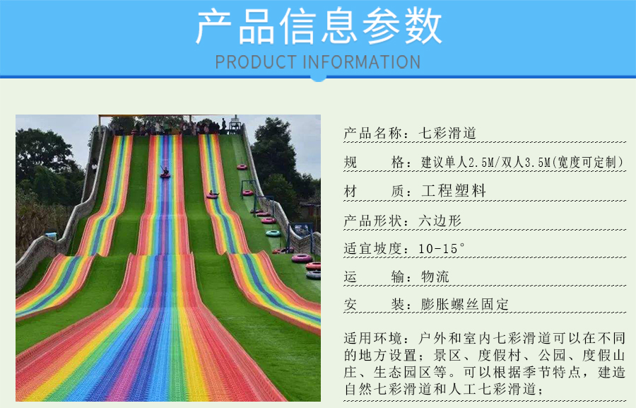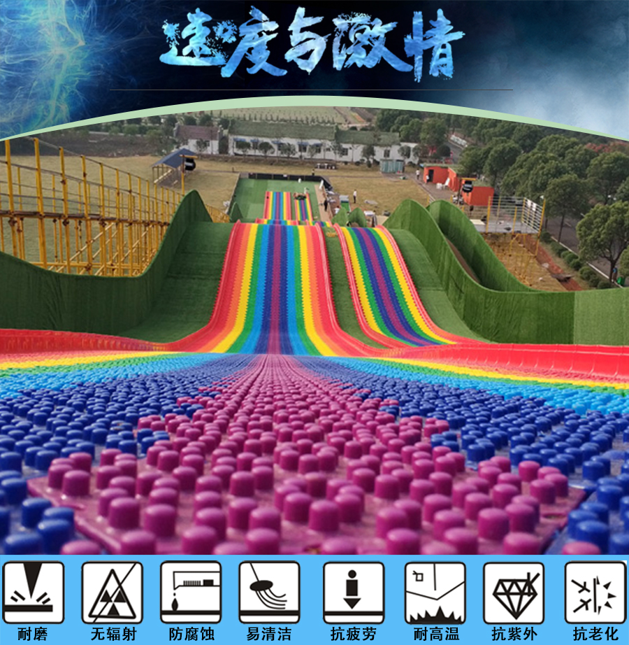 【產品名稱】七彩滑草 【產品規格】2.1/3.4,滑道尺寸可根據場地調整 【產品特點】GS認證,耐磨,無毒 【產品用途】七彩滑道可以在不同的地方設置;景區、度假村、公園、度假山莊、生態園區等。可以根據季節特點,建造自然七彩滑道和人工七彩滑道 【聯系方式】18057734889