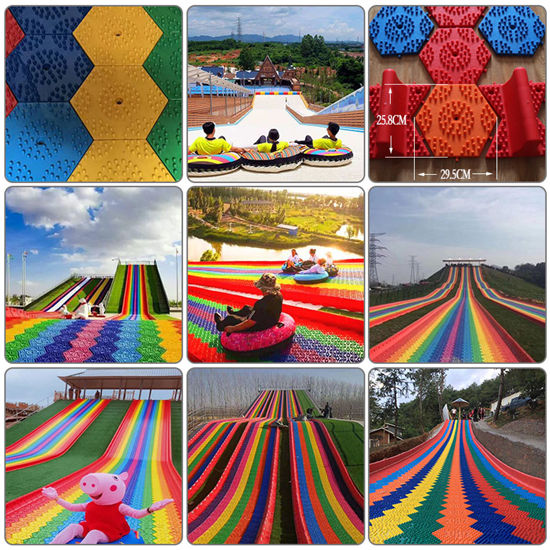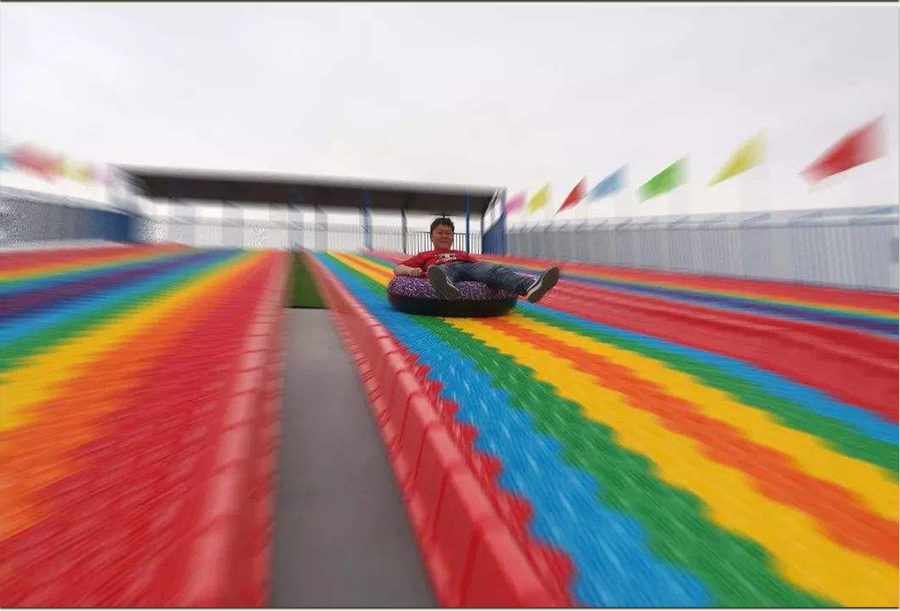 七彩滑梯主要核心部件滑板是采用環保樹脂PE,經一次性注塑工藝成型的模擬滑雪材料。經過實踐與改良,探索出如下圖所示的棒棒糖形狀的旱雪滑板,滑雪板六邊形組合成大型滑道,多色拼搭,遠看就像山間掛著的彩虹,非常吸引觀眾的眼球,遠看就有向往的沖動。