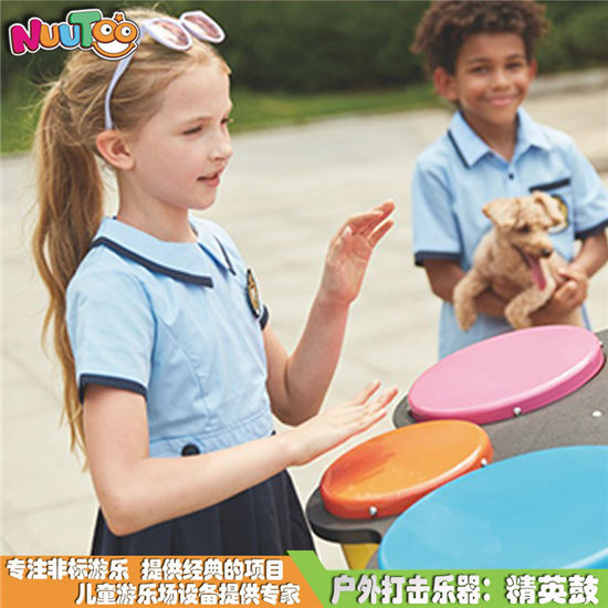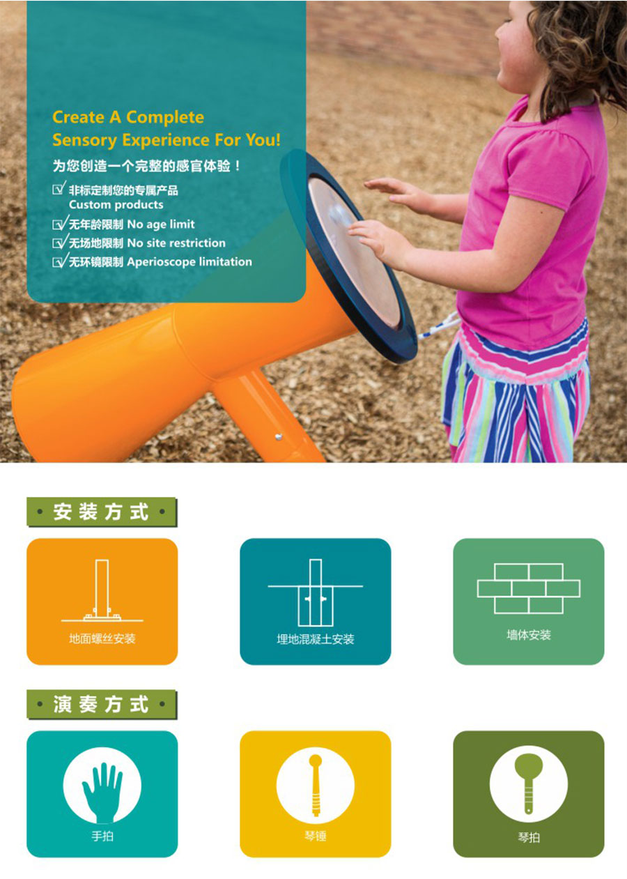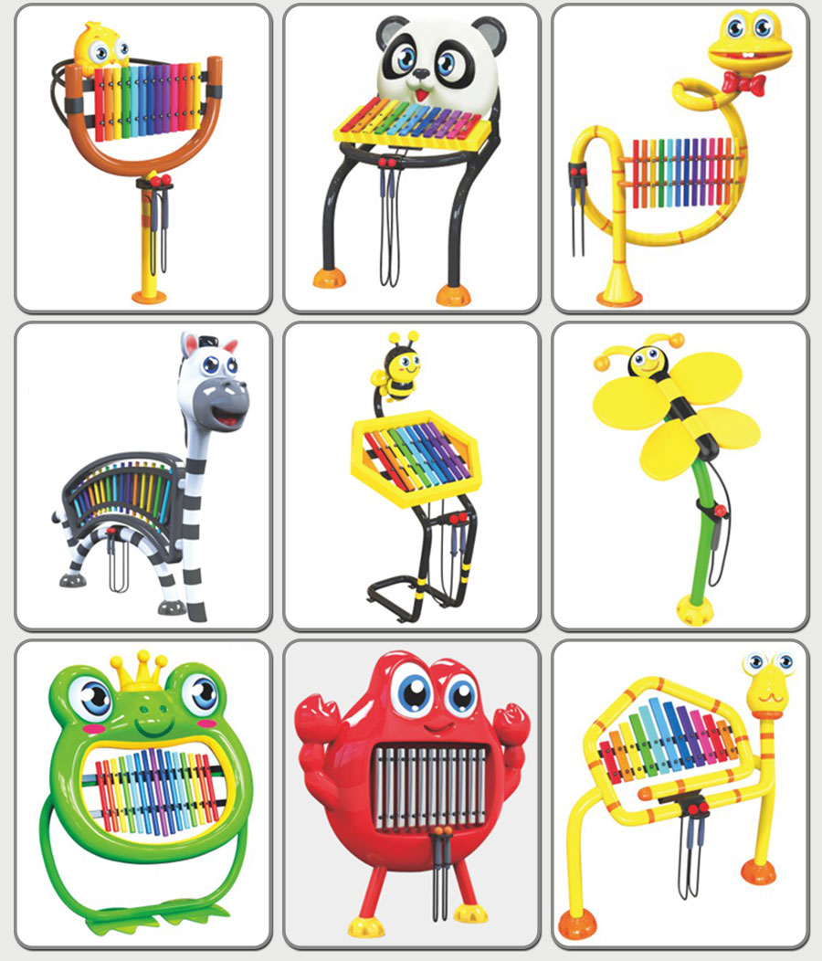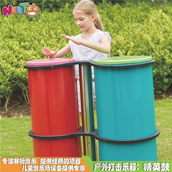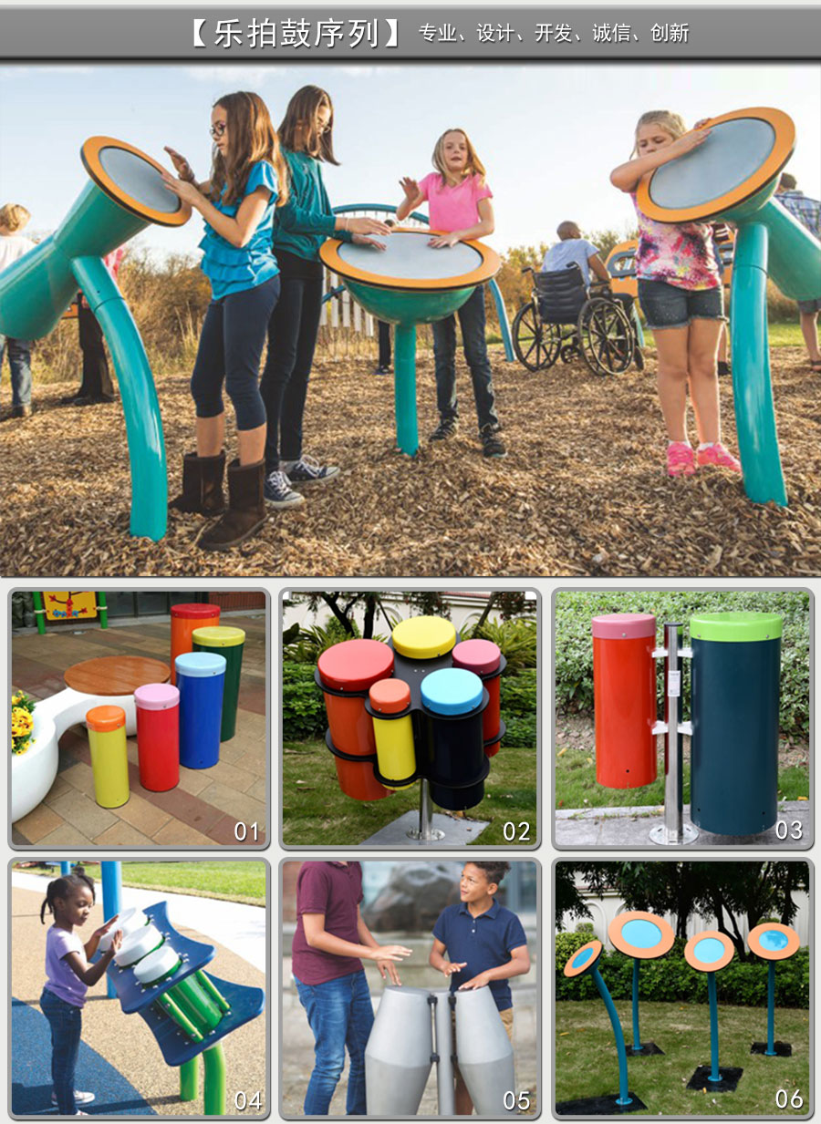 打擊樂器也叫“敲擊樂器”,是指敲打樂器本體而發出聲音的。其中有些是有固定音高的打擊樂器,如云鑼、編鐘等;其它還有一些無固定音高的打擊樂器,如拍板、梆子、板鼓、腰鼓、鈴鼓等。若根據打擊樂器不同的發音體來區分,可分為兩類:(1)“革鳴樂器”也叫“膜鳴樂器”,就是通過敲打蒙在樂器上的皮膜或革膜而發出的樂器,如各種鼓類樂器;(2)“體鳴樂器”,就是通過敲打樂器本體而發聲的,如鐘、木魚、各種鑼、鈸、鈴等。本公司基于樂器的本身特色,制作的各種戶外打擊樂器,如樂拍鼓,在保留了本身了樂器的元素,又增添了兒童愛玩的元素