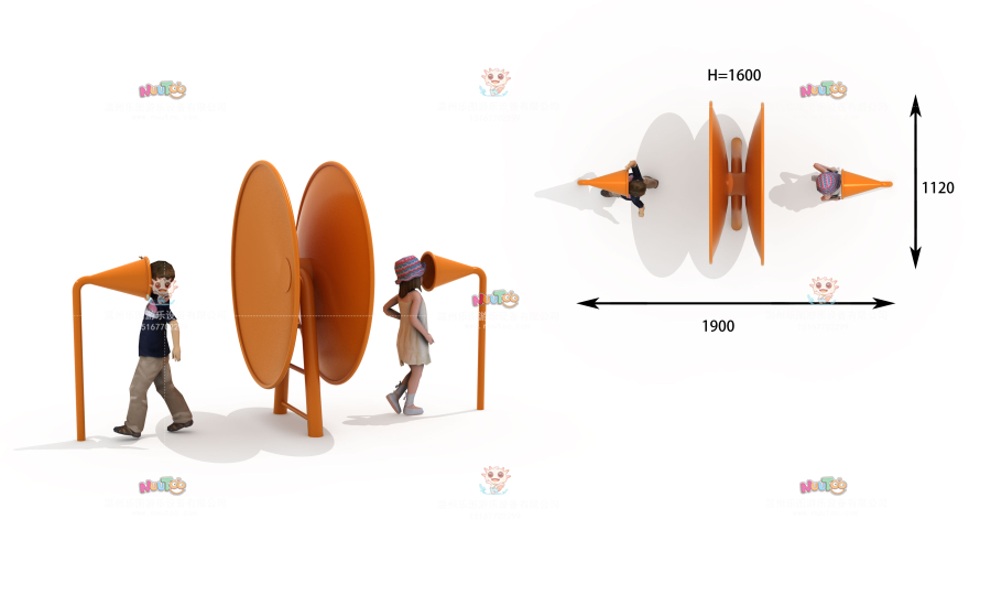名稱:回音傳聲筒? 規(guī)格:L1900*W1120*H1600? 外觀:大擴(kuò)音喇叭形狀,吸引受眾的參與? 教育意義:通過相互對(duì)話,管道傳遞剩余,且背面產(chǎn)生回聲,引導(dǎo)孩子互動(dòng)思考空氣傳播聲樂的原理