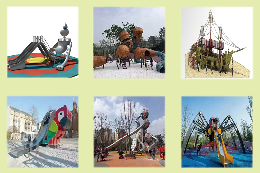 非標景觀游樂產品可根據客戶場地的需求與規格尺寸進行規格設計,種類風格多種多樣,常見的風格有小丑系列滑梯、松果系列組合滑梯、海盜船、巨鹿滑梯等系列風格。