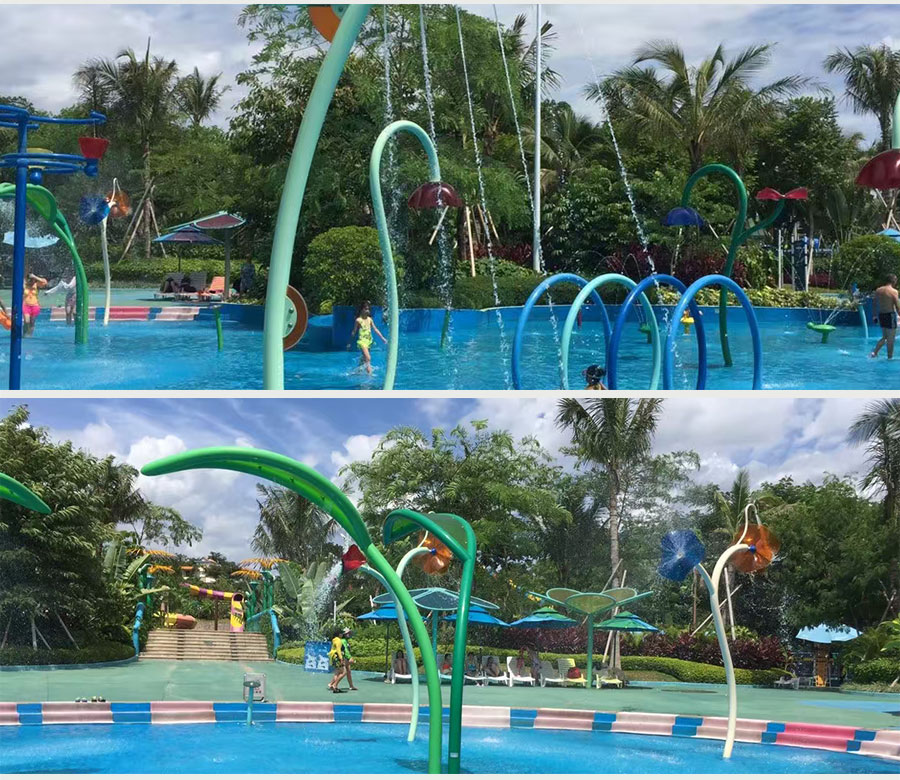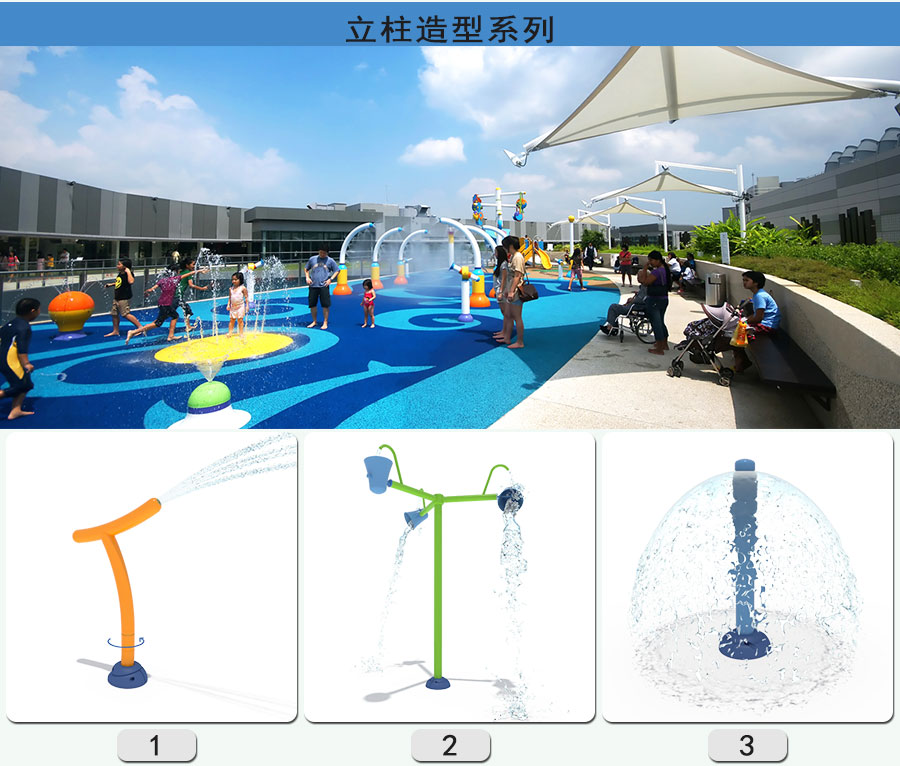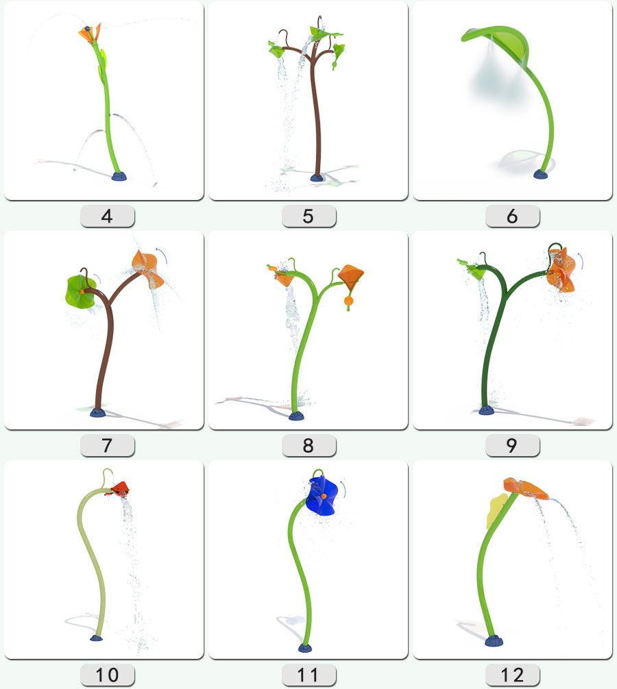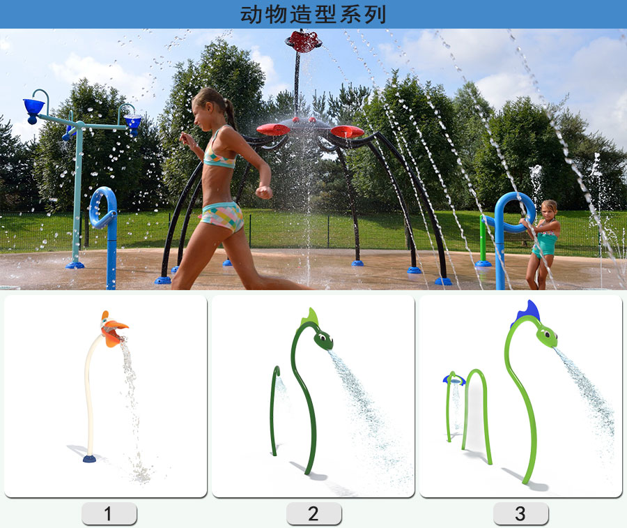 水上樂園戲水小品當前樂圖主要有五個系列產品,分別是動物造型噴水、花葉造型噴水、立柱造型噴水、環形造型噴水、傘狀造型噴水上百種組合。