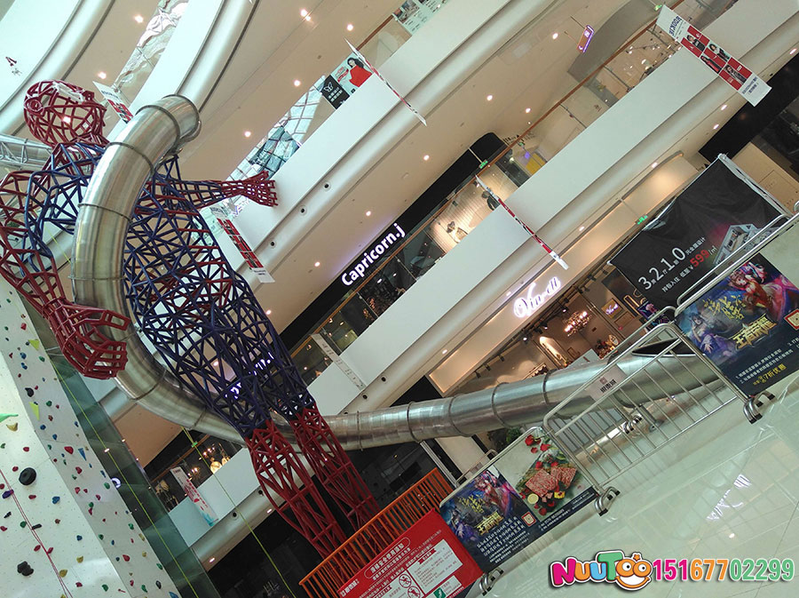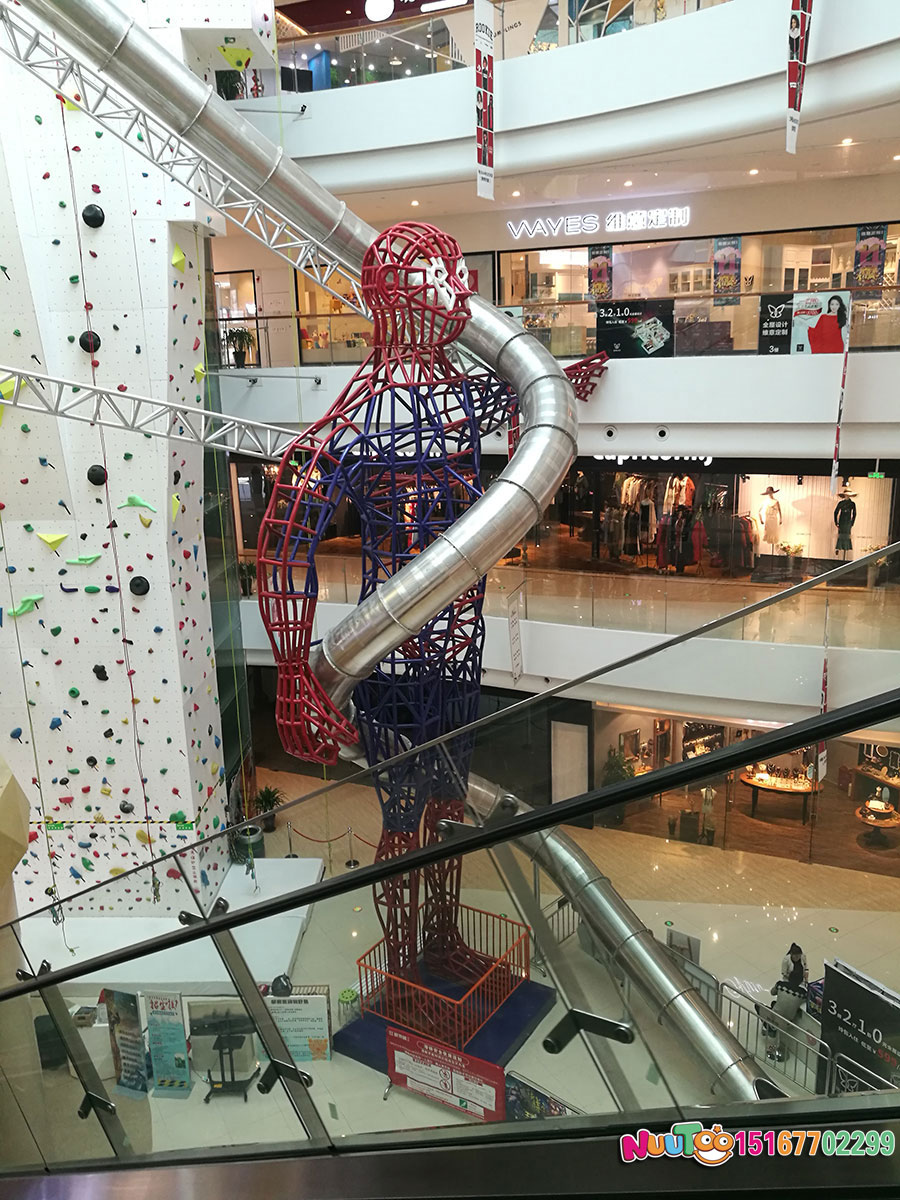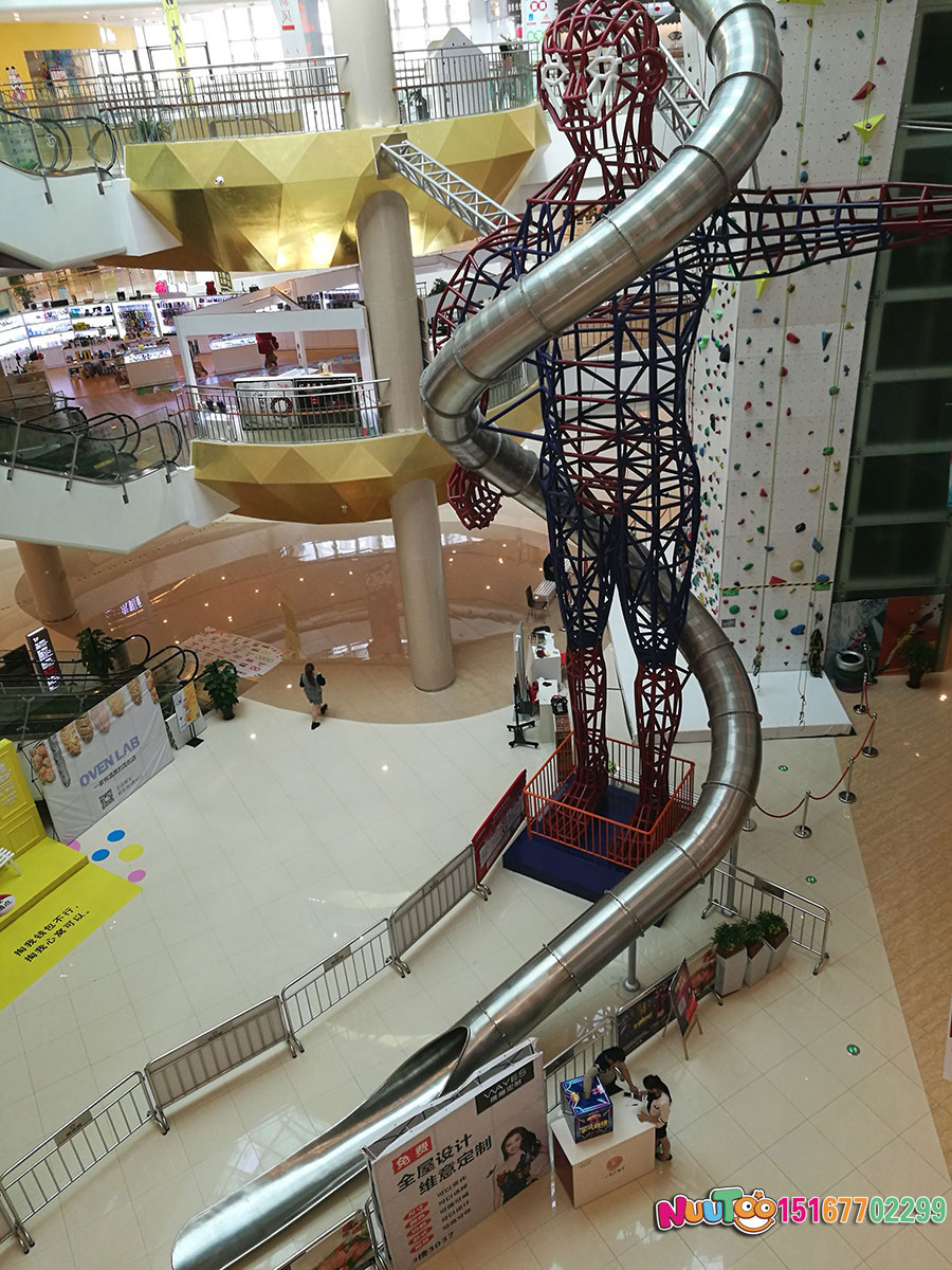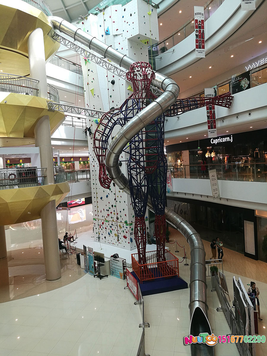 這款位于臺州市銀泰購物中心的不銹鋼滑梯是大型的室內綜合性游樂項目,高達聳立的直筒滑梯從上而下的刺激感為體驗者們帶來了無限的樂趣,僅此之外,還有用鋼架組成的一個人物聳立在購物中心內,給整個場館帶來了更多游玩的人來此拍照打卡。搭配著近6米的室內攀巖,更是讓不銹鋼滑梯錦上添花,充滿了游玩的趣味。
