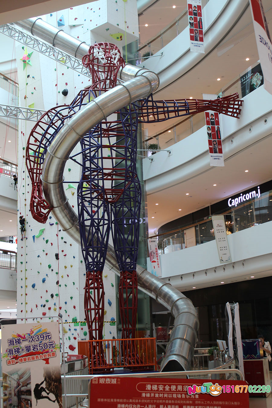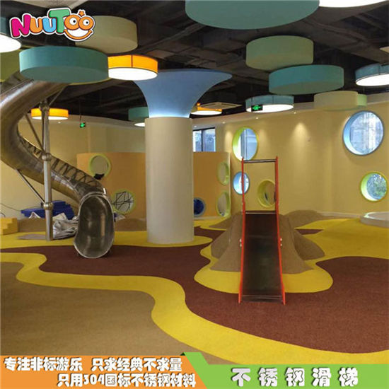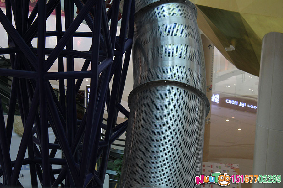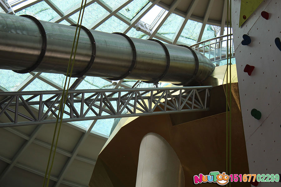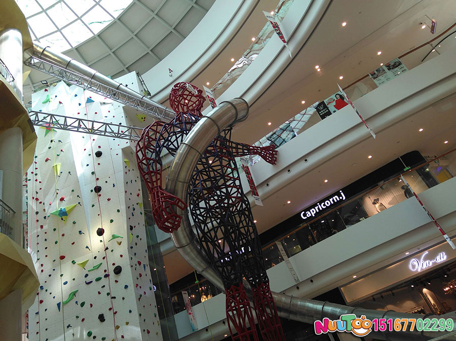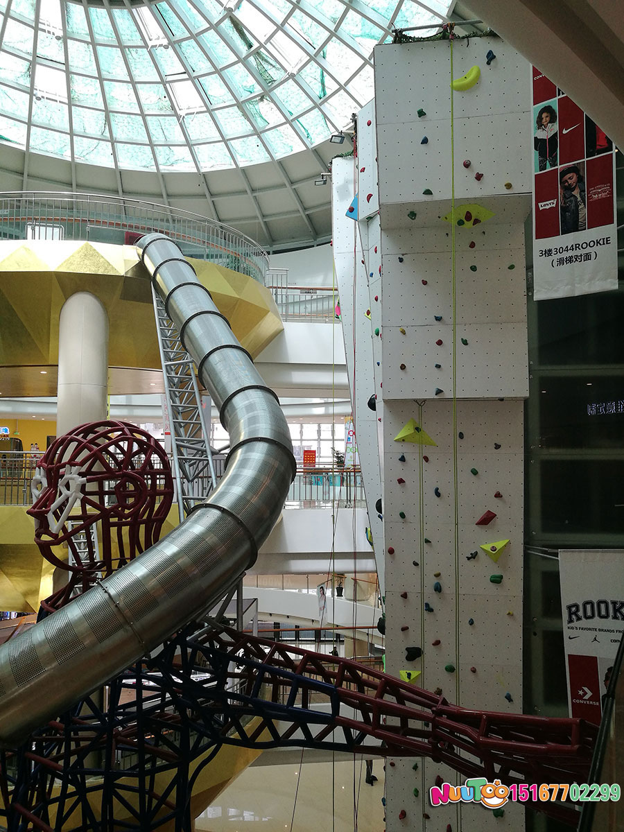 這款位于臺州市銀泰購物中心的不銹鋼滑梯是大型的室內綜合性游樂項目,高達聳立的直筒滑梯從上而下的刺激感為體驗者們帶來了無限的樂趣,僅此之外,還有用鋼架組成的一個人物聳立在購物中心內,給整個場館帶來了更多游玩的人來此拍照打卡。搭配著近6米的室內攀巖,更是讓不銹鋼滑梯錦上添花,充滿了游玩的趣味。