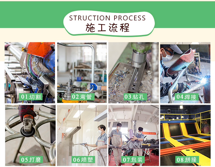 1、主架:鍍鋅管、專業巖板 2、輔材:PVC 3、滑梯:LLDPE |